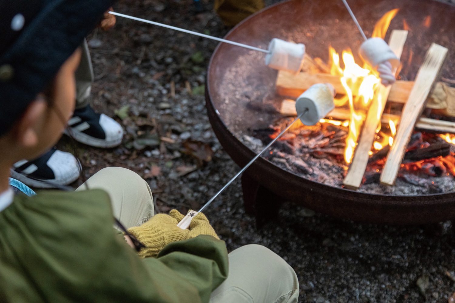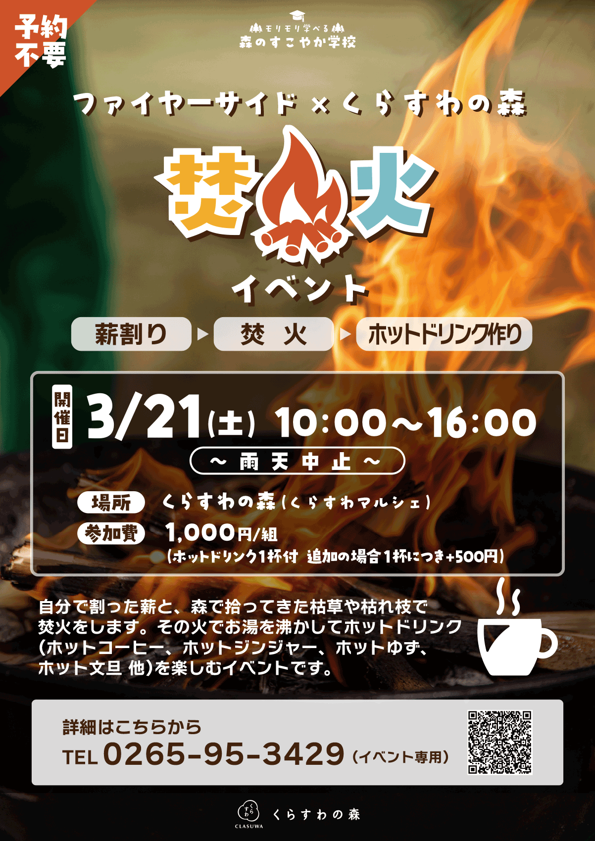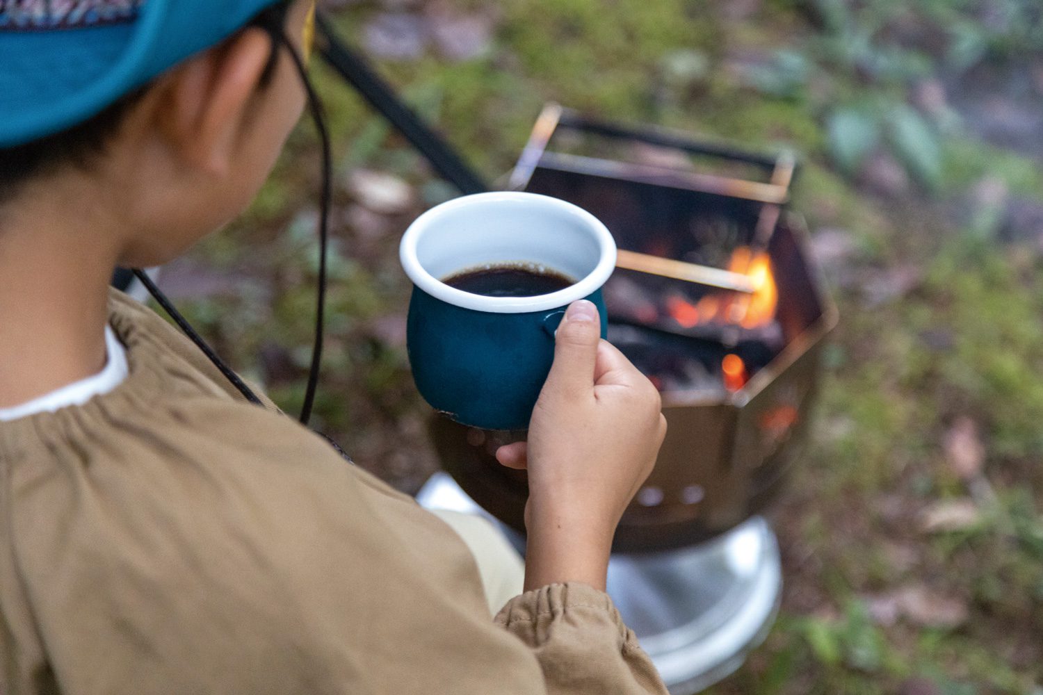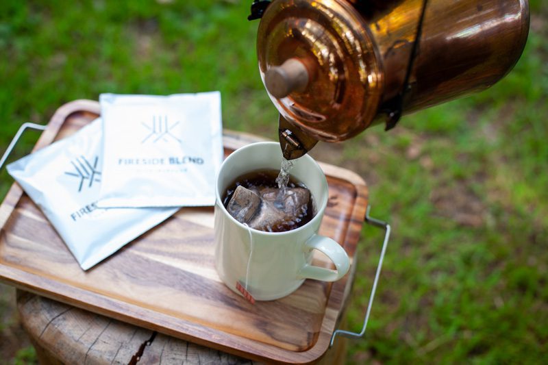 割った薪や枯れ枝等で焚火をし、お湯を沸かしてホットドリンクを楽しみます。