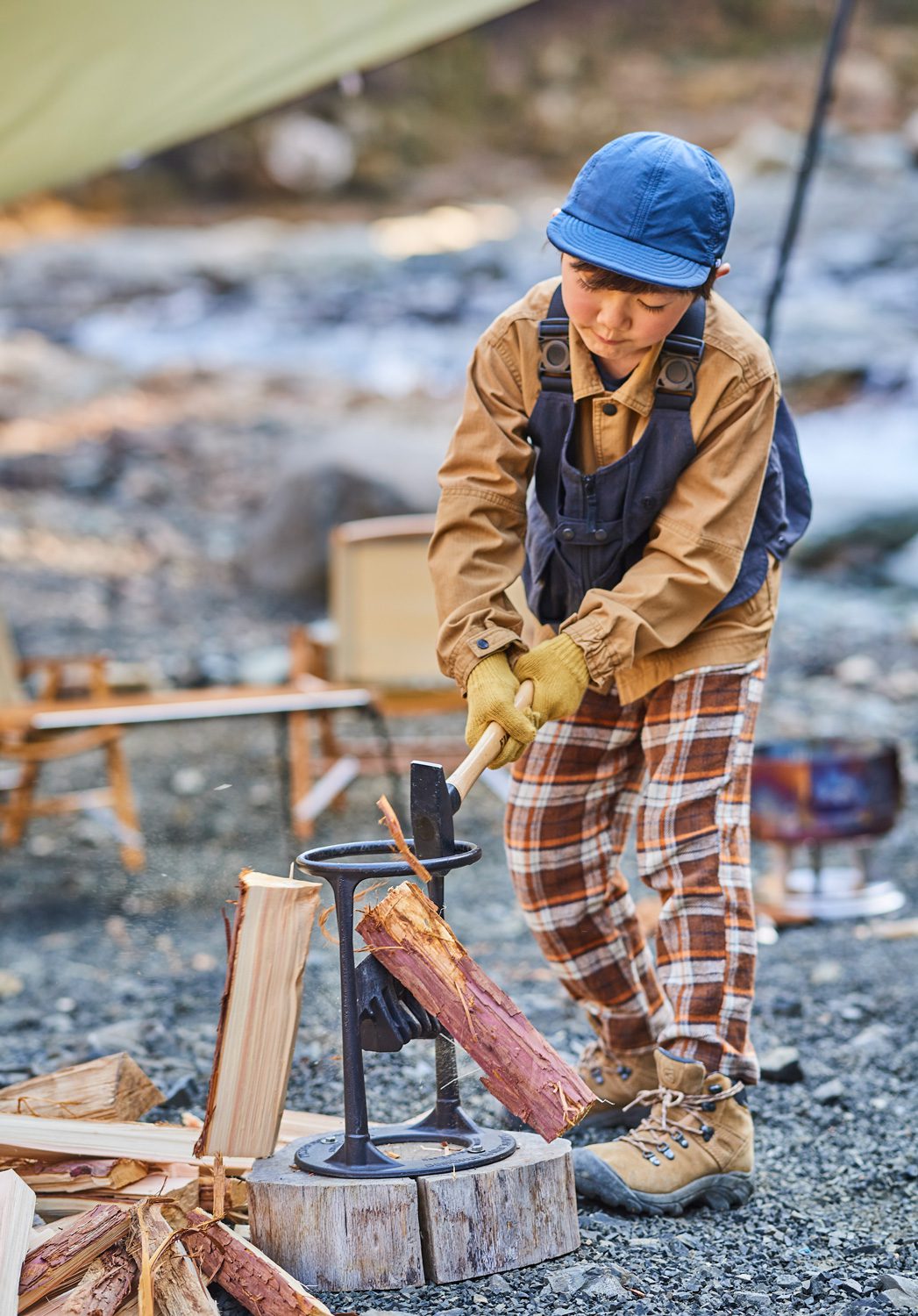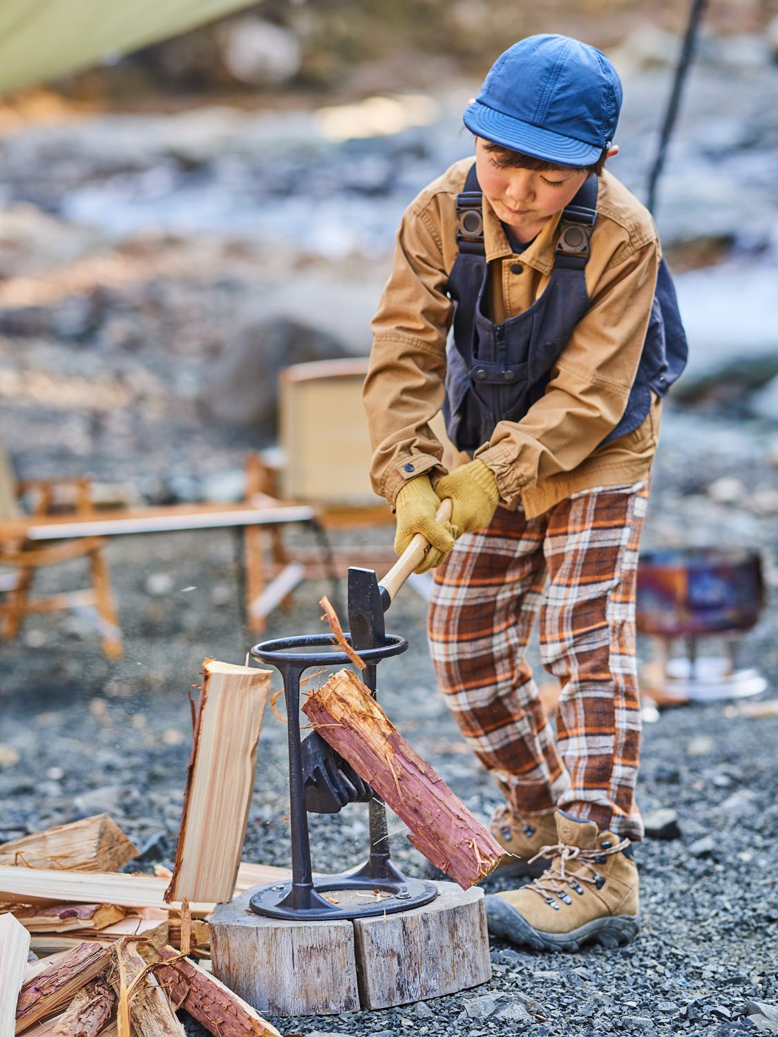 子供でも簡単に薪割りが出来るキンドリングクラッカーを使っての薪割り体験。