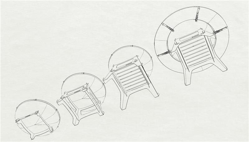 ボウルに支えを掛け、6枚のテーブルを繋ぐことでボウルの周囲にカウンターを設置します。