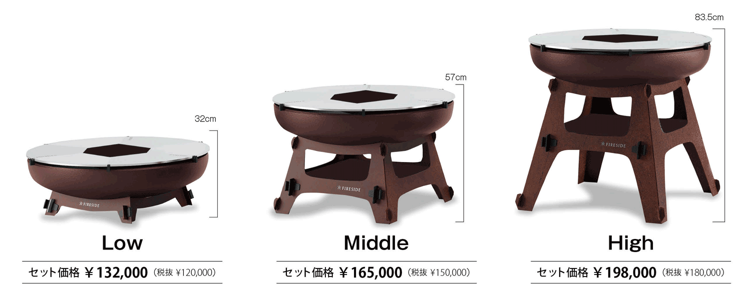 大地に近い目線で楽しむLow(#48133)、座っても立っても使えるMiddle(#48134)、立食でも囲みやすいHigh(#48135)。3種類のベースから、シチュエーションに合わせて高さを選択できます。