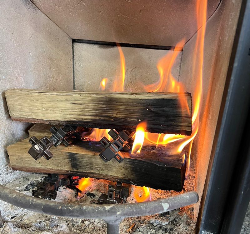 十字型キューブを連結した形状により、さまざまな炉内でも薪を安定した位置に配置できます。