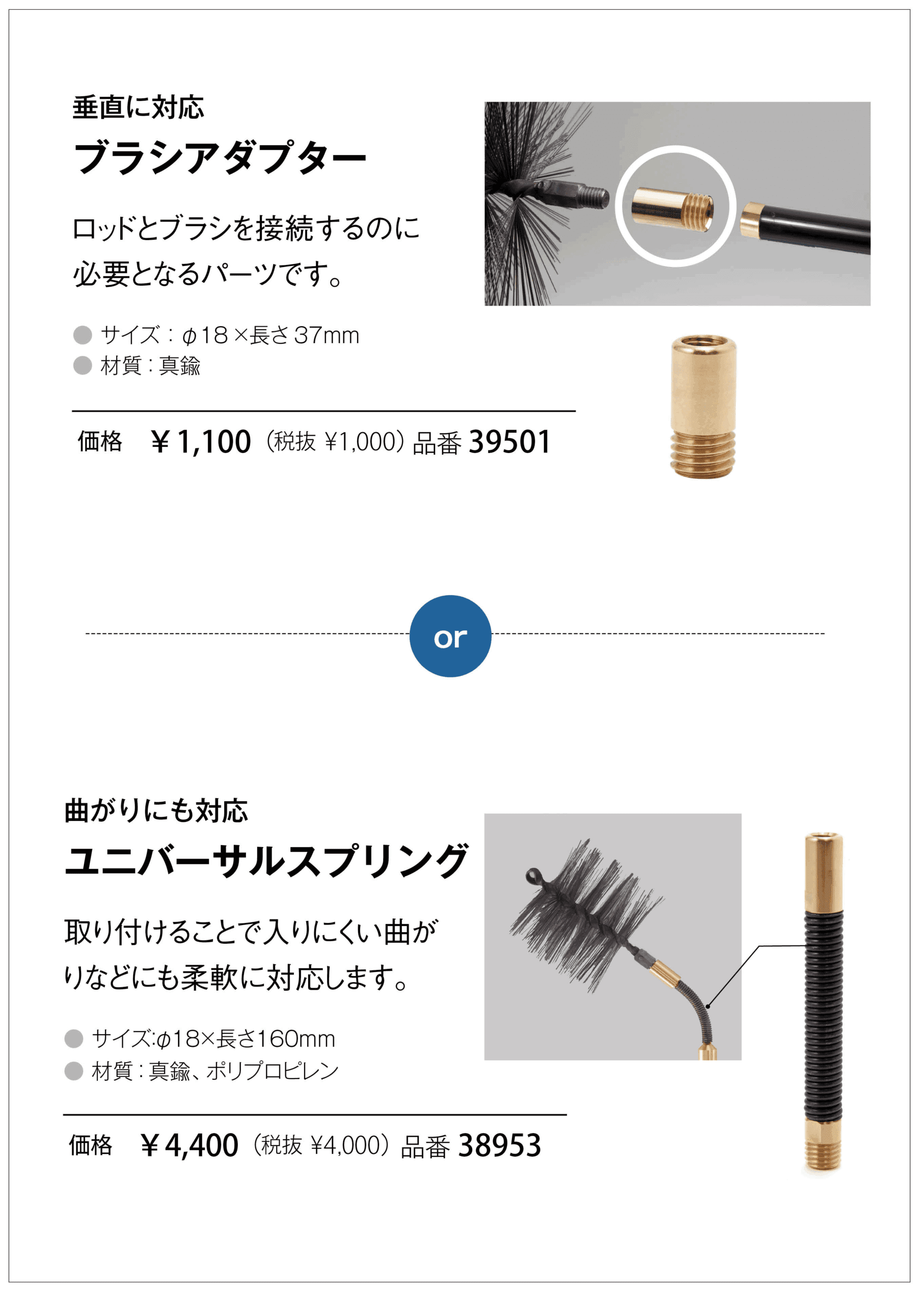ファイヤーサイド ユニバーサルロッド Universal Rod ¥3,300(税込) 品番 38623 Share 煙突掃除に用いるロッドです。 回転方向は時計回りのみの使用になります。 逆回転させるとブラシやロッドの接続部分が外れる場合がありますのでご注意ください。 対応ブラシと接続用パーツ スペック サイズ 直径20×長さ1000mm 材質 真鍮、ポリプロピレン 生産国 日本